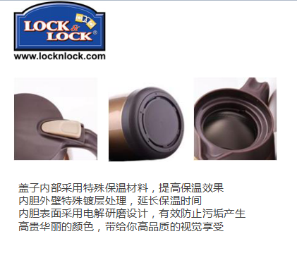产品规格:17.9 × 13.5 × 24.6cm 1.5L 材质:S/S304+PP+PP+硅胶 装箱明细:8PCS/箱 包装方式:彩盒 产品描述: 盖子内部采用特殊保温材料,提高保温效果;内胆外壁特殊镀层处理,延长保温时间;内胆表面采用电解研磨设计,有效防止污垢产生;高贵华丽的颜色,带给你高品质的视觉享受。